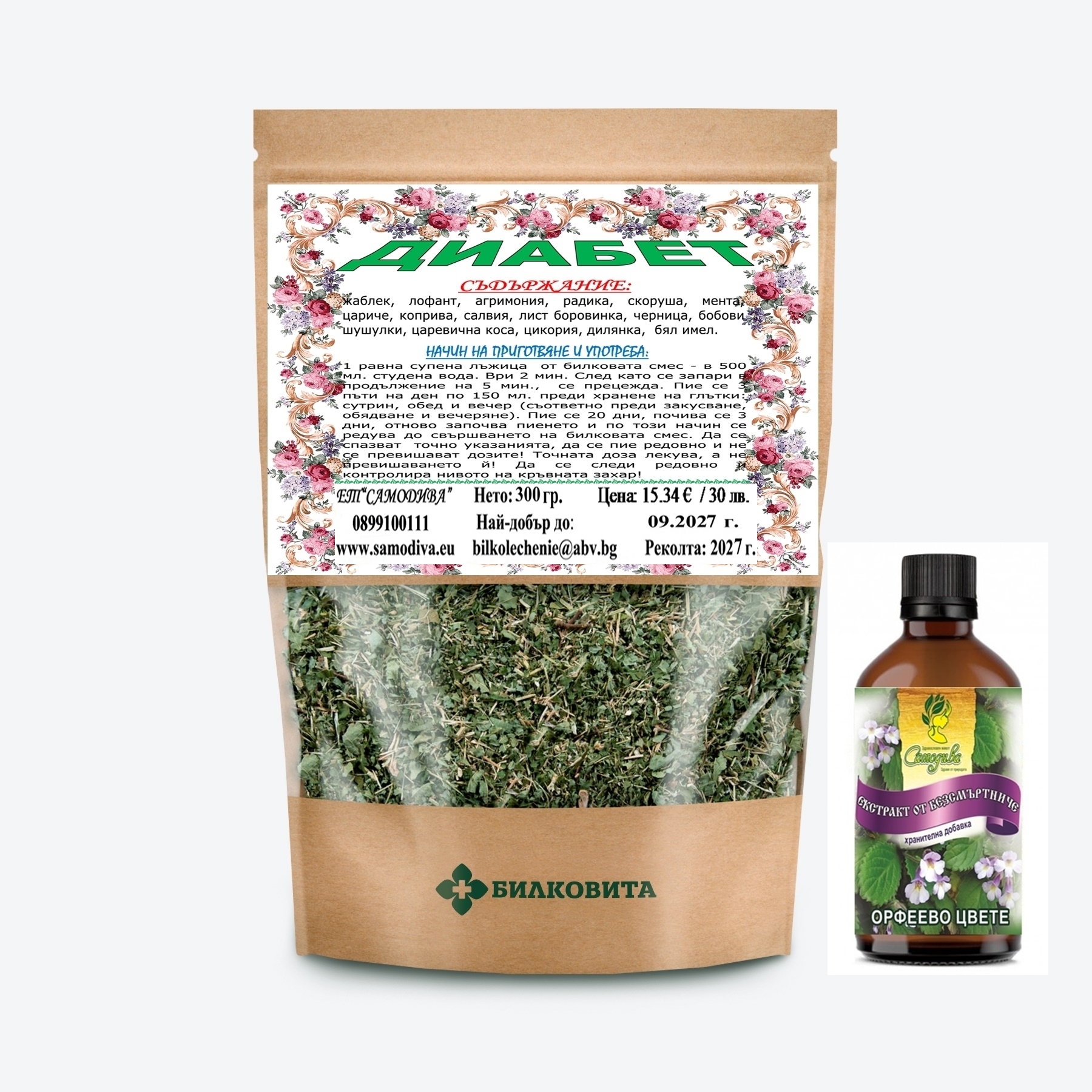 Съдържание: жаблек, лофант, агримония, радика, скоруша, мента, цариче, коприва, салвия, лист боровинка, черница, бобови шушулки, царевична коса, цикория, дилянка,  бял имел.