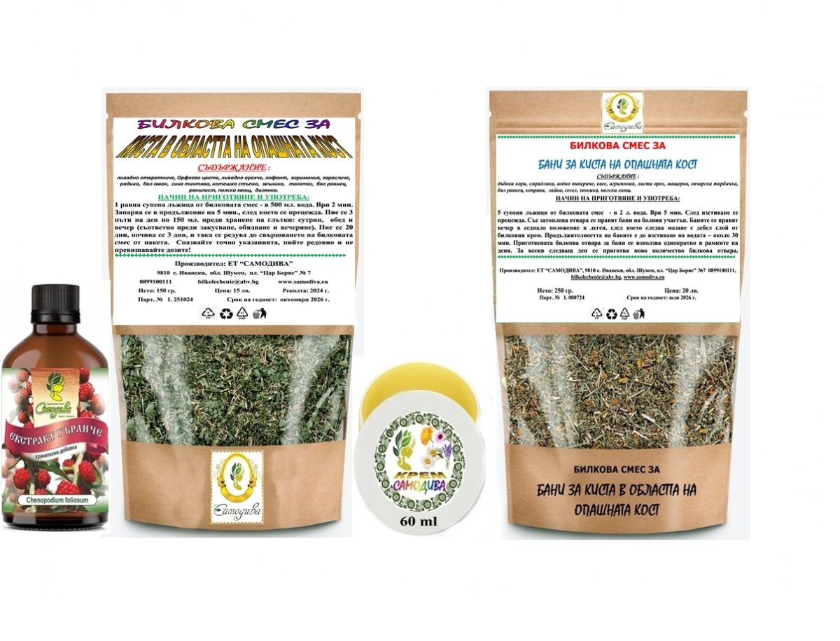 ЗА ВАШИЯ СЛУЧАЙ: Всекидневно, три пъти на ден преди хранене: сутрин, обед и вечер (съответно преди закусване, преди обядване и преди вечеряне), се пие билкова отвара по 150 мл., приготвена от пакета с надпис: “БИЛКОВА СМЕС ЗА КИСТА В ОБЛАСТТА НА ОПАШНАТА КОСТ”. Спазват се съответните указания за начина на приготвяне и употреба, написани на табелата. Пие се 20 дни, почива се 3 дни, и така се редува до свършването на билковата смес от пакета. Да се пие редовно и да не се превишават дозите! Точната доза лекува, а не превишаването й!